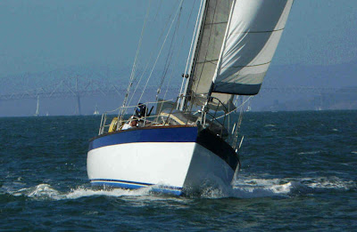 Winds were pretty strong-- 15-20 knots or so, and soon we were blasting wesstward against the flood current, and this lovely Catalina passed to port, sailing on the sparkling waters of the bay.